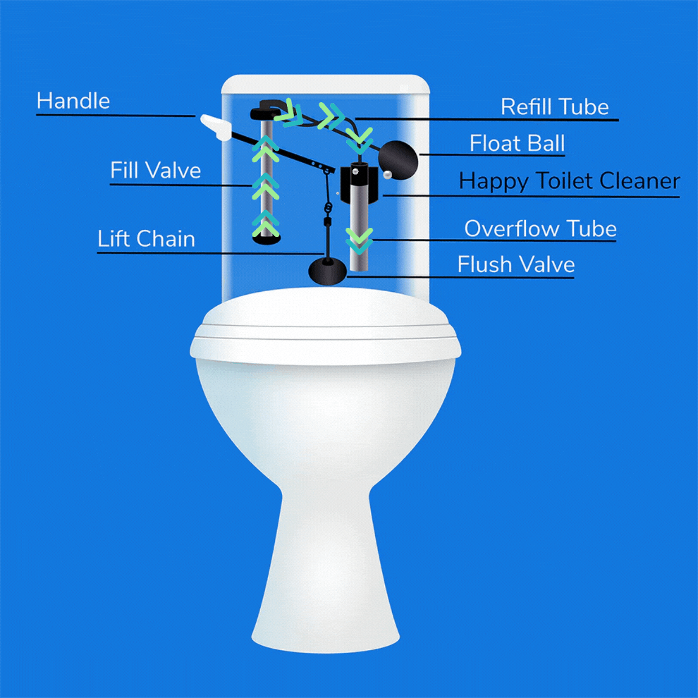 Say hello to the Happy Toilet™ — the simple, automatic solution for keeping your toilet bowls spotless with every flush.